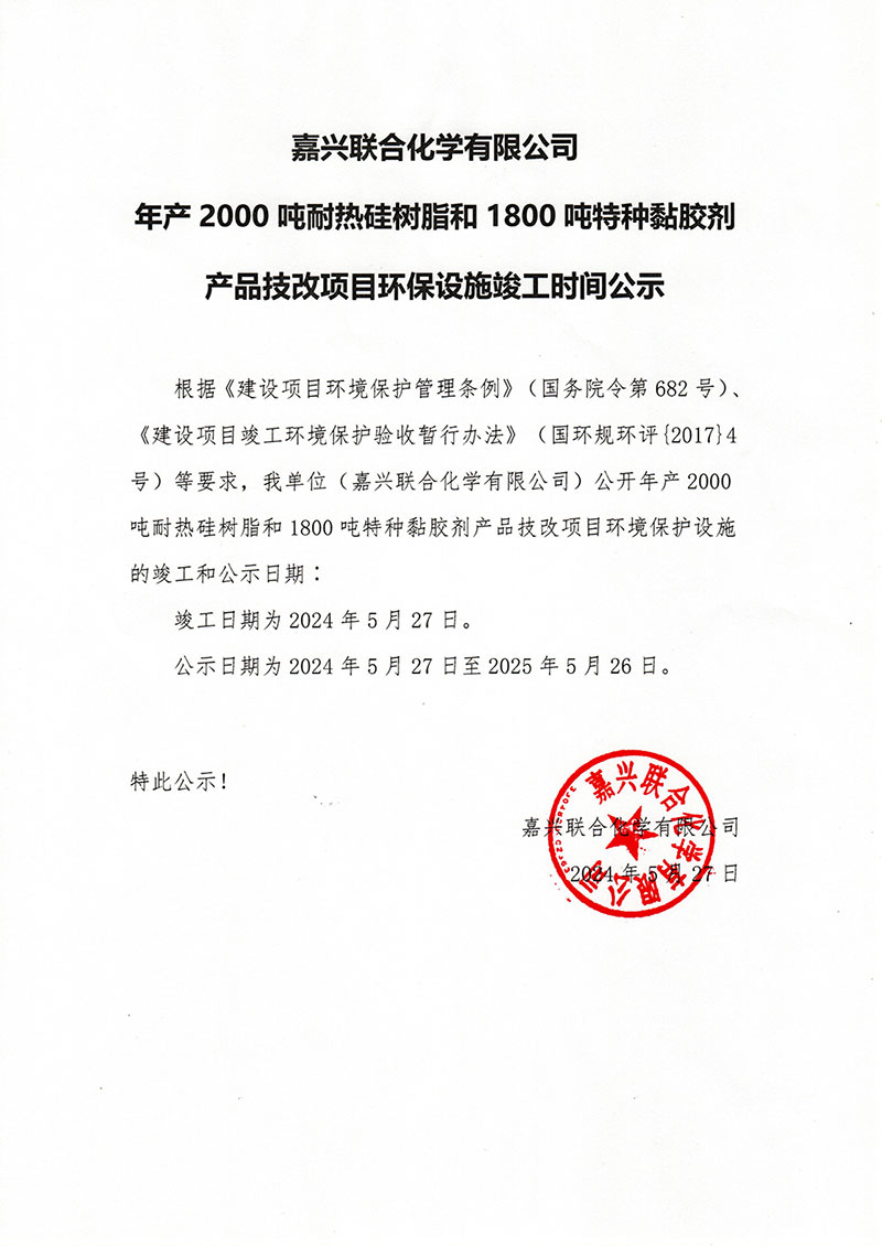 嘉興聯(lián)合化學(xué)年產(chǎn)2000噸耐熱硅樹脂和1800噸特種黏膠劑產(chǎn)品技改項(xiàng)目環(huán)保設(shè)施竣工調(diào)試時(shí)間公示